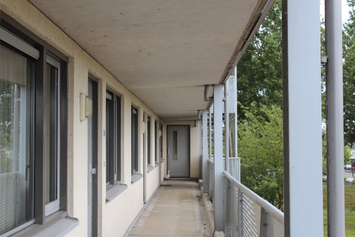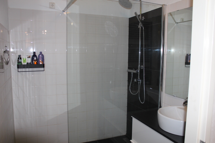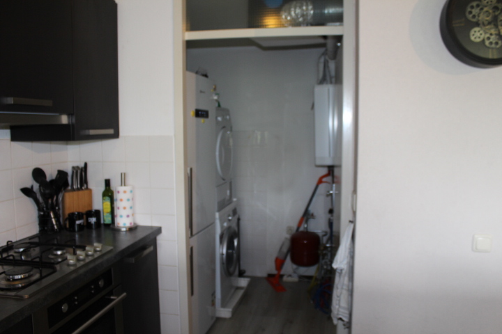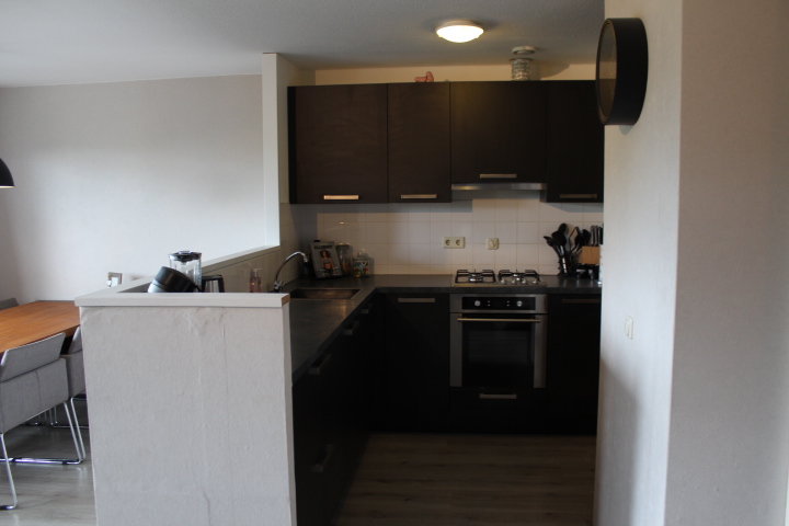 De keuken in L-opstelling heeft een lichte kleurstelling en is uitgerust met een groot fornuis van RVS, oven en afzuigkap. Vanuit de hal heb je toegang tot een tweetal slaapkamers. De badkamer is uitgerust met een wastafel en een douche.