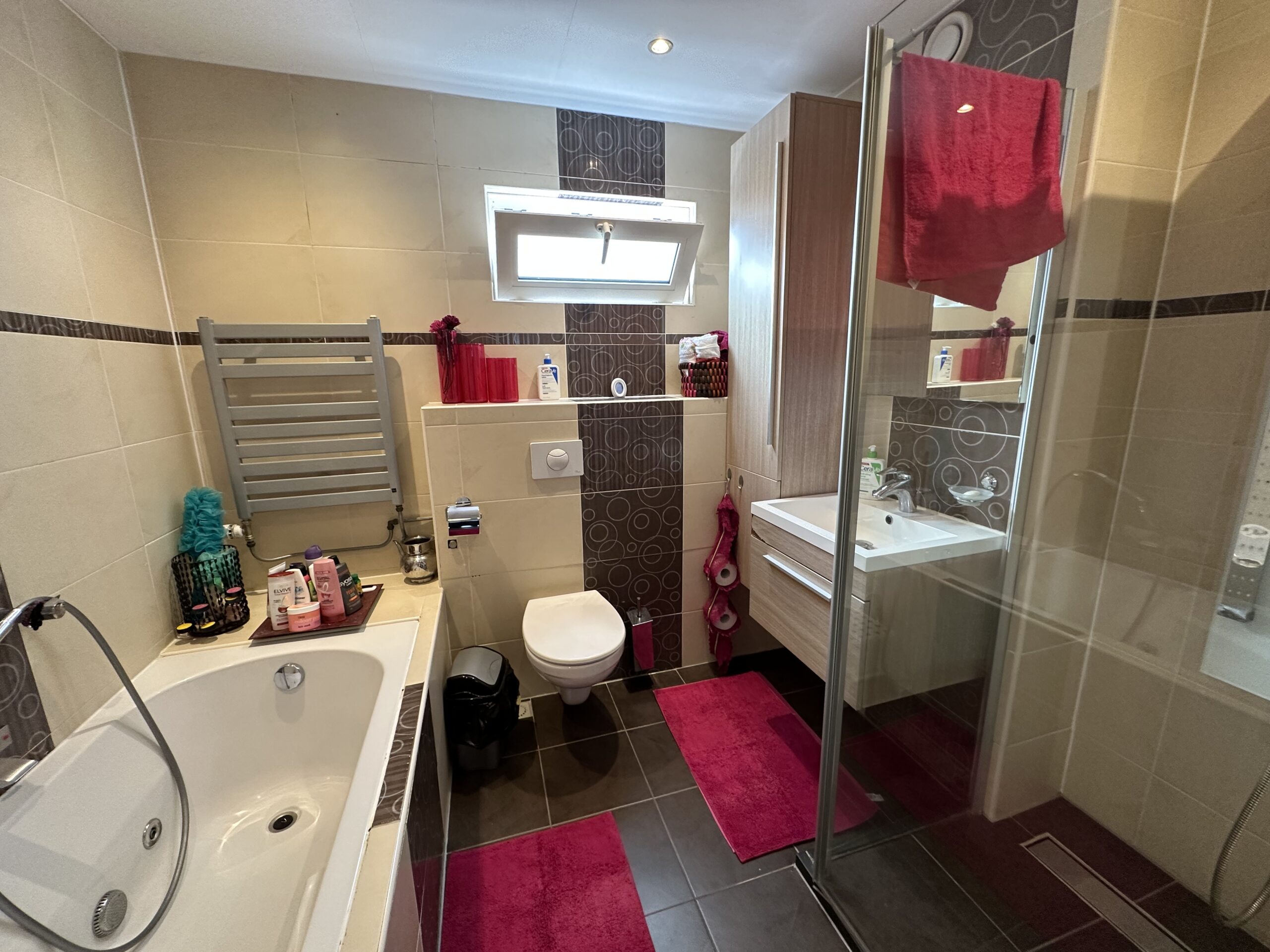 Eerste verdieping: Ruime overloop met toegang naar een grote slaapkamer en heerlijke badkamer. De badkamer is onder andere voorzien van een ligbad, één toilet, douchecabine en een wastafel met meubel. Met een vaste trap kunt u de tweede verdieping bereiken.