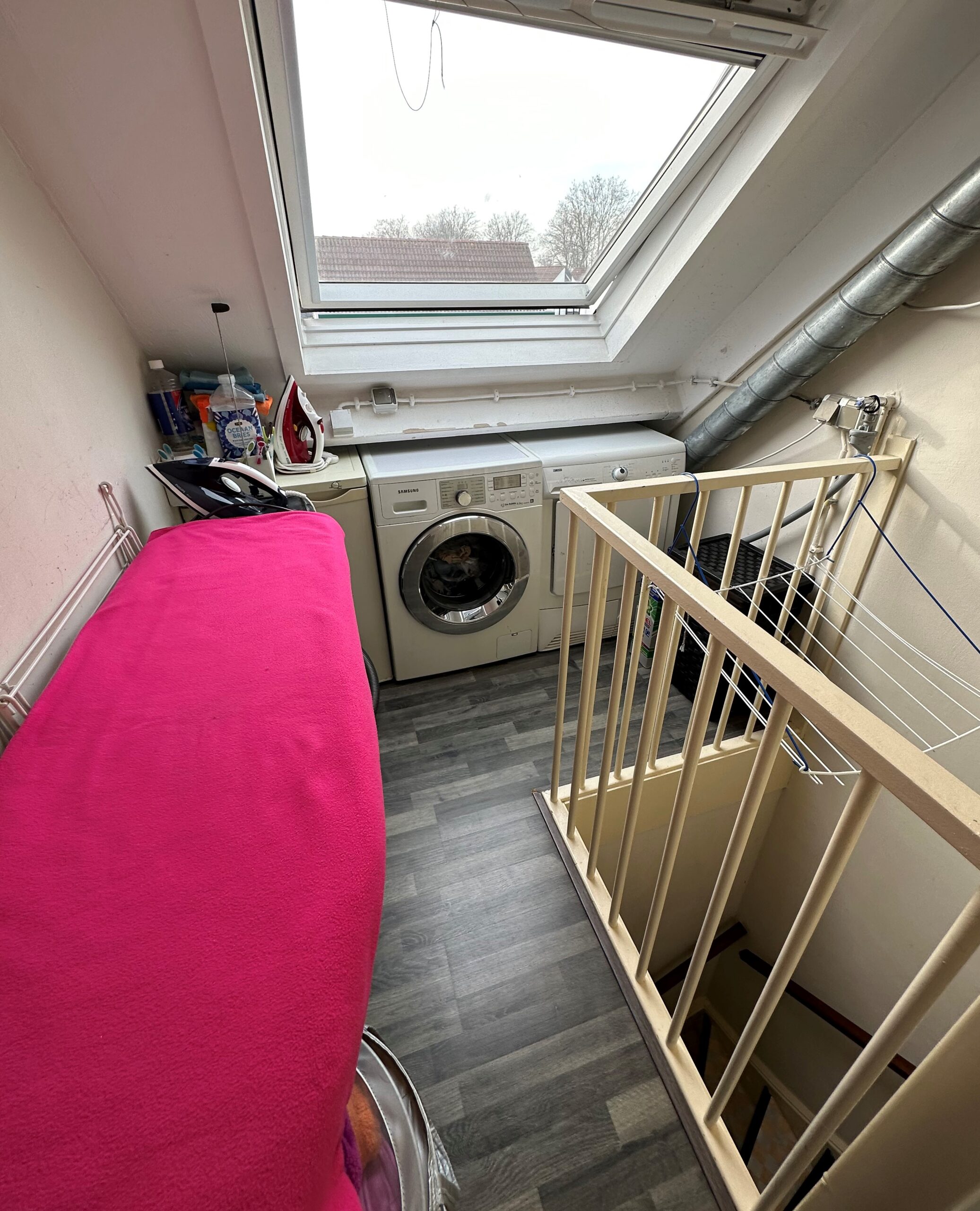 Tweede verdieping: Via de vaste trap bereikt u de tweede verdieping. De tweede verdieping is opgedeeld in twee delen , met de grootse slaapkamer van het huis met een aparte wasruimte in de gang. De wasruimte bevindt zich aan de voorkant van de woning. De slaapkamer bevindt zich over de gehele lengte van de woning en geeft u zicht op de achtertuin.